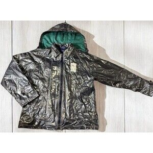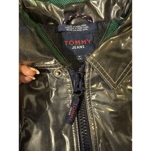 This vintage 90s TOMMY JEANS Rain Coat is a unique unisex jacket featuring a clear PVC vinyl shell over a navy blue background. It has a mid-length with long sleeves and a snap closure. The coat is hooded and lined with polyester, making it suitable for winter, fall, and spring. The jacket has a punk rock and 80s-inspired style, perfect for travel, parties, or casual wear. It is rare and available in size M.