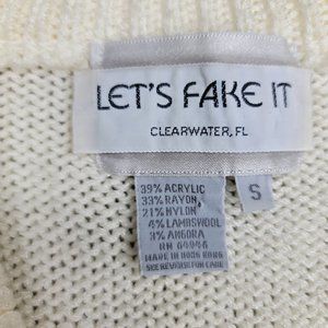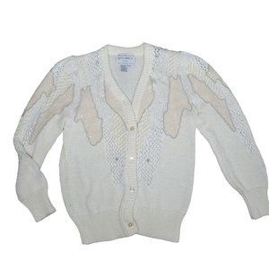 This vintage 90s cardigan sweater is a stylish blend of angora and lambswool. Its chunky knit design, adorned with shimmering sequins and beads, comes in a versatile cream-white hue, perfect for a size S wardrobe.