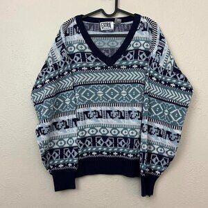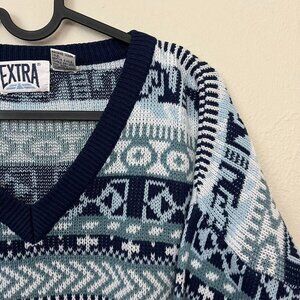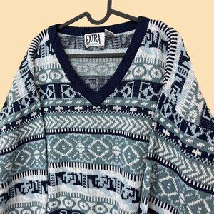 90s knit, oversized sweater, retro print, acrylic fabric, boxy fit, vintage sweater, quirky design, bold pattern, preppy style, grunge-inspired