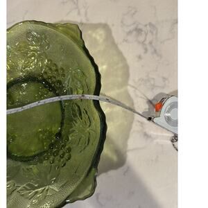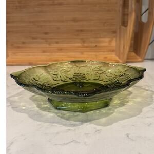 Add a touch of vintage charm to your home with this beautiful Anchor Hocking green glass footed serving bowl. The raised grape and leaf pattern, often referred to as the "Harvest Green" or "Grapes and Leaves" pattern, adds a touch of elegance to any space.