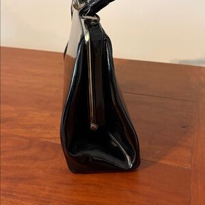 Elevate your style with this chic black patent leather clutch. Perfect for evening outings, its sleek design adds a touch of elegance to any ensemble.