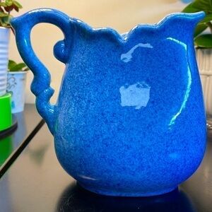 𝅺vintage Calico China, Blue Pitcher with rooster motif, 6 1/2 inches tall