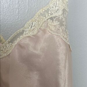 This elegant cream chemise is crafted from a silky fabric, featuring delicate lace trim and thin spaghetti straps. Its flowing silhouette and subtle sheen offer a timeless . See the photo for more details.