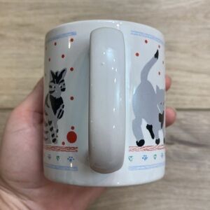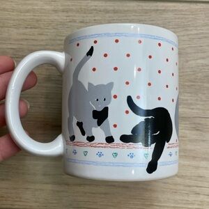 Classic americana country style vintage coffee or tea mug by The love mug. Features minimalist cats and kittens in grey and black with a red polka dot background with light blue and green paw print border. In excellent condition. 8 ounces 8oz