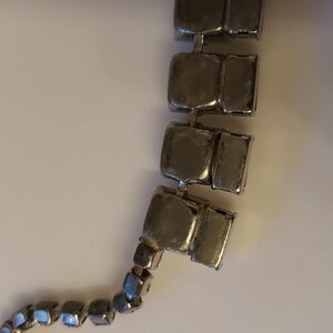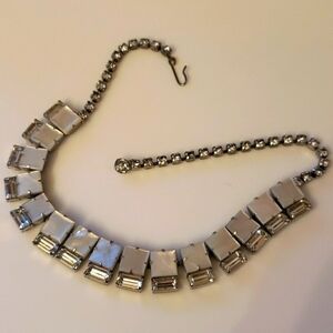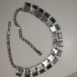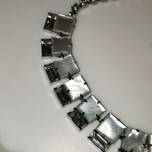 Striking deco-style vintage necklace is made of silvertone metal, prong-set with crystal rhinestones and squares of mother of pearl. It measures approx 15" long and 5/8" wide, with a shepherd's hook clasp, and is in very good condition. The colors in the "mother of pearl", catches the light, combined with the crystal, are truly beautiful. You can see the craftsmanship on the reverse side.