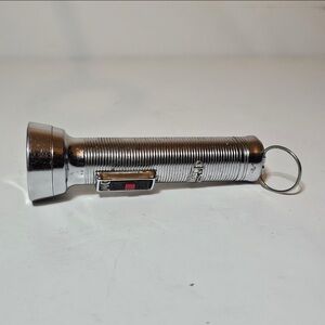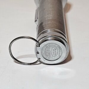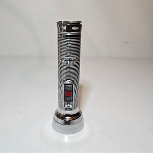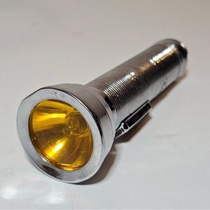 vintage Eveready Captain union carbide flashlight with yellow light Working silver tine metalic shows signs of wear such as scratches will be shipped with no batteries sold as is see pictures for reference