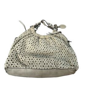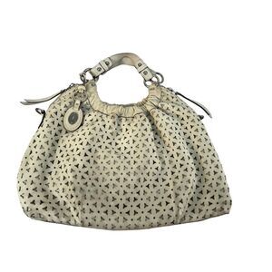 12 x 19, floral lazer cut soft leather with logo bag charm and the usual stainless steel hardware detail, color tan in really nice condition the wear is normal but missing the detachable strap rings are still there can be replaced but the double handle work great wearing it on the shoulder