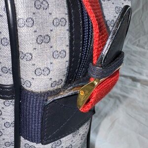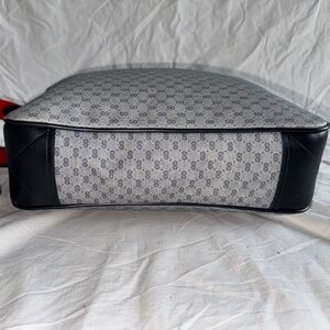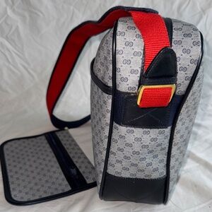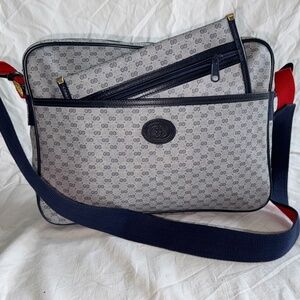 vintage . GUCCI blue+gray monogram canvas+leather messenger bag . EUC