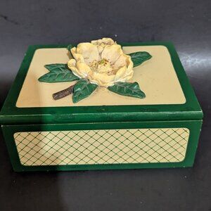 vintage Handpainted Green Cream trinket jewelry Box With 3D Magnolia Flower