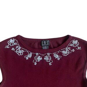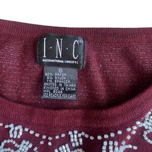 international concepts burgundy / maroon knit sweater with high neckline and white beaded detailing. material is thick and very soft with some stretchiness.