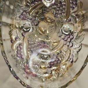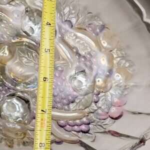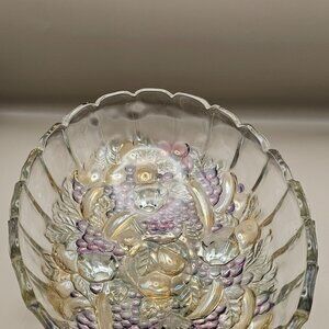 clear pressed glass with detailed embossed design on bottom of bowl, outer surface - grapes, leaves and apples