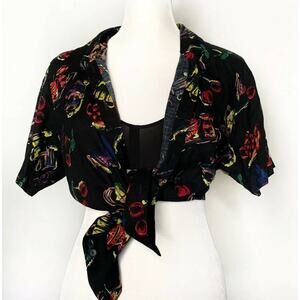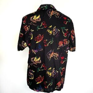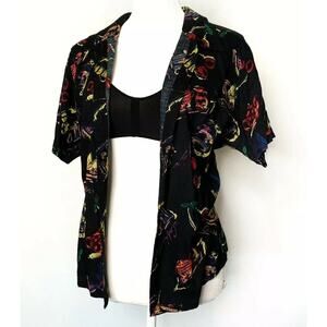 VTG JR Bentley Women's size Large Button Down Shirt With split hem side black Multicolor print short sleeve