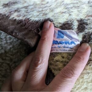 Really cool oversized kitty cat print blanket! Unique design that is REVERSIBLE. Opposite side features a rad looking negative reverse print. Blanket side is shades of brown, tan, toffee, cream, and tiny yellow speckles. Blanket is made of thick fuzzy flannel material. It is soft and fairly heavy. Made in Spain by "Mora."