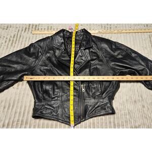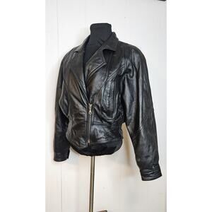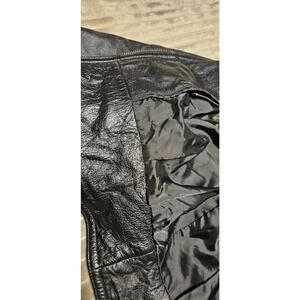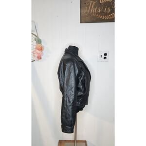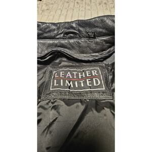 Get ready to rev up your style with this vintage Limited leather bomber motorcycle jacket in size XS. Crafted from supple black leather, this short-length jacket features a solid pattern, long sleeves, and a 1/2 zip front closure, adding an edgy touch to any outfit. The jacket is perfect for those looking for a unique addition to their wardrobe, particularly those who appreciate vintage fashion.