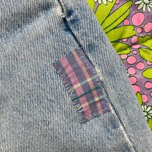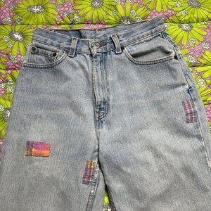 Levis vintage 90s 512 high waisted jeans. Distressed and reworked with vintage patches, some fraying, and a tiny stain. Light wash all cotton no stretch. Would best fit a S-M, but please see the measurements to ensure a perfect fit. Freshly laundered. Here to help if you have any questions.