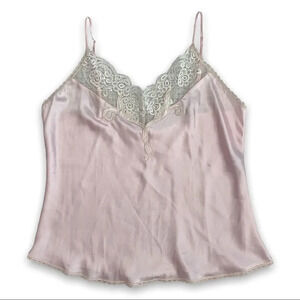 super pretty light pink satiny lingerie style tank with ivory lace details from the brand “Natori”