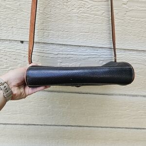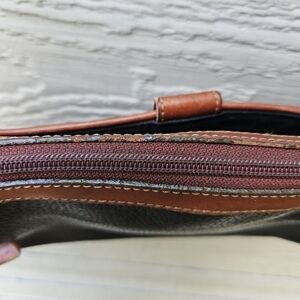 Classic rectangular black leather purse with long strap to be worn as a shoulder bag or crossbody. Has brown trim and strap and brass hardware, including a YKK zipper. Fabric lined interior has a zippered pocket. One external slip pocket. Strap is adjustable