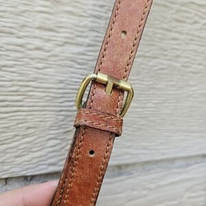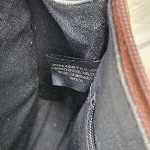 Condition notes: minor discoloration along the edge of the leather by the zipper, the upper left corner of the back, and on the strap where the buckle had previously been set.