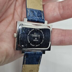 Blue rectangular face watch with silver tone case. Battery replaced April 2025.