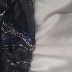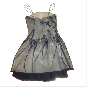vintage Marlena special occassion spaghetti strap navy blue sequin on black mesh overlaying cream colored satin mini dress. Great for prom, homecoming, red carpet, new years eve, etc. Measures approx 16" pit to pit across back, 13 5" waist, 37" length. Full skirt w 4 layers - mesh, satin, tulle mesh and poly lining. Check out our closet and bundle to save 💵bundles over 5 lbs will require purchase of extra postage, offers always welcome 😊Non-smoking cat friendly home 😻Bookmark our closet as new items added weekly 💕thank you for shopping our closet.