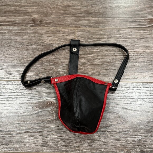 This is a vintage Mr S Leather San Francisco men’s leather jockstrap costume in a rare and hard to find style. Crafted from genuine black leather with bold red trim, this piece features a structured leather pouch, full leather straps, and classic snap hardware throughout. The construction and stitching reflect the high quality craftsmanship Mr S Leather is known for, making this a standout collector piece in vintage fetishwear.