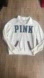 Off-White pullover with bold navy PINK logo. Features a quarter-zip design. Pocket has blue and orange stripe detail. sooooo y2k 🧡💙
