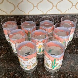 Set of vintage Southwestern-themed drinking glasses, known for their distinctive adobe house and cactus designs.