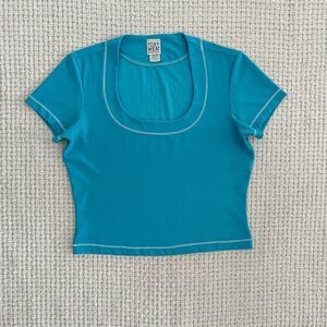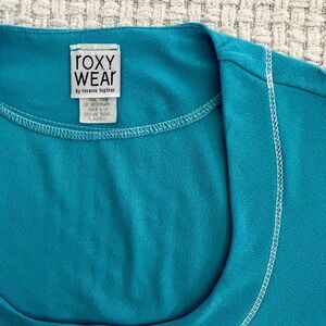super pretty blue “roxy wear by roxane heptner” short sleeve top with a scoop neckline
