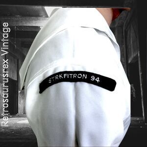 This white polyester pullover jumper top is crisp and clean. It has a pocket over both the right and left sides of the chest. The sleeves are long and each side has a patch. The left arm is the medic patch and the rank patch The right side has STRKFITRON 94 in navy. The neckline is cut in a V and there is a fabulous 'hood that drapes over the back of your shoulders.