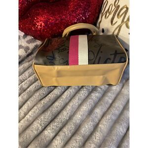 Brown pink and white striped faux, leather handbag, /satchel doctors drs bag barrel purse, pocketbook, leather logo stamp, Victoria’s Secret VS