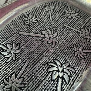 A silver oval tray with a textured surface and a pattern of palm trees embossed into the surface.