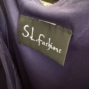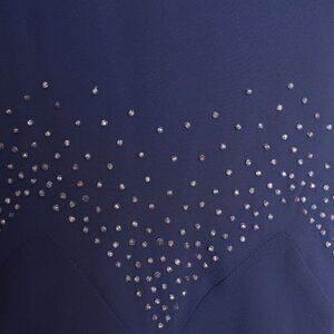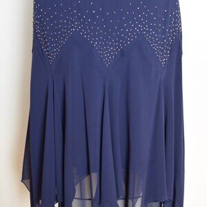 This is a super cute vintage party dress from the late 90s/Y2K. It's made of light-weight, semi-sheer woven crepe (feels like polyester, fully lined) that's navy blue with beading on the bottom. This dress has a hankie hem and it slips over the head with no closure.