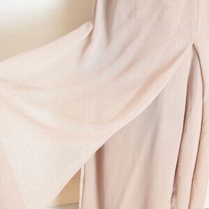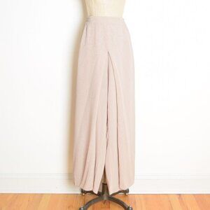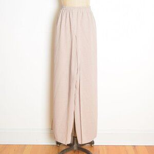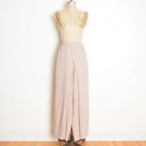 This is a cool pair of vintage pants from Y2K. They're made of semi-sheer polyester crepe (fully lined) that's beige with glittery sparkles in the weave. These pants have a high elastic waist, carwash flap legs, and they pull on with no closure.