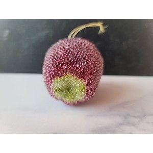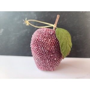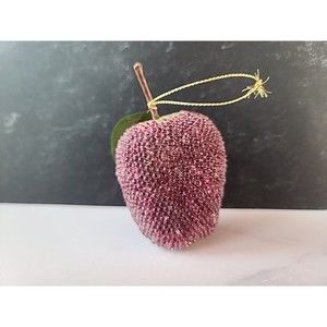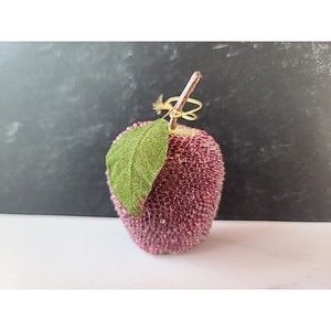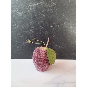 This is a vintage Christmas ornament in the shape of a purple apple with stem and leaf comprised of several small beads.