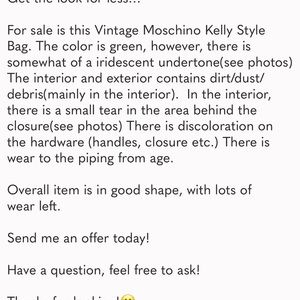 Please note this item is in vintage preowned condition No tears or rips , has fade discoloration because of age but it kinda makes it cool. Inside is in good condition including gold buckles and hardware. Excellent Heavy duty gold handle and tags and awesome excellent condition moveable MOSCHINO LETTERING on longer carry shoulderbag strap with scratches and signs of wear as seen in photos