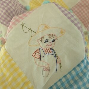 vintage baby crib quilt blanket hand embroidered nursery Cat, Clown, Rabbits *re