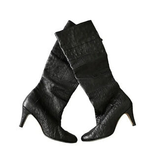 Elevate your style with these vintage black leather knee-high boots featuring an exciting animal print. These boots are perfect for any fashion-forward woman who wants to make a statement. The pointed toe and high heel measuring at 3-3.9 inches provide a comfortable fit for any occasion. Crafted with high-quality leather and lined with leather, these boots are durable and perfect for the fall, winter, and spring seasons. The knee-high shaft style and cone-shaped heel style add a touch of elegance to these boots. These boots are perfect for any woman who wants to add a unique touch to her wardrobe.