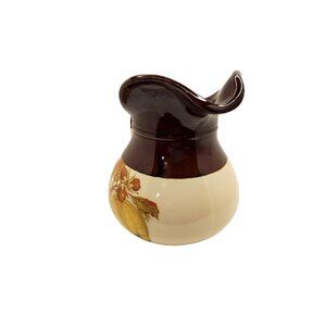 A charming vintage 1960s Marked McCoy on bottom "Fruit Festival" pitcher, perfect for collectors. This glazed art pottery stoneware piece boasts a vibrant fruit design, adding a splash of mid-century charm to any home decor.