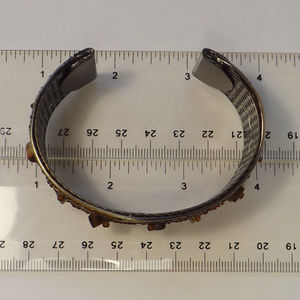 1970s vintage cuff bracelet artisan hippie steampunk statement piece up cycled amber tigers eye gemstone beads sturdy metal with small amount of give for adjusting silver tone mesh brass wires waves solid end caps good vintage condition no detected issues gently adjustable - should fit 7" wrist 1 1/4" wide interior wrist opening: 2" to 2 1/2" wrist access: 1 1/4" 1.5 oz (42 grams)