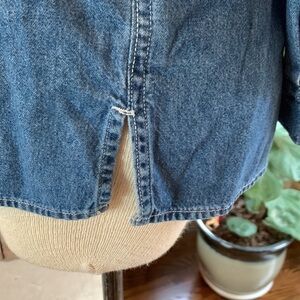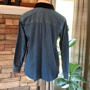 EUC denim Christmas embroidered button down top size small. Velvet feel collar with holly embroidery.