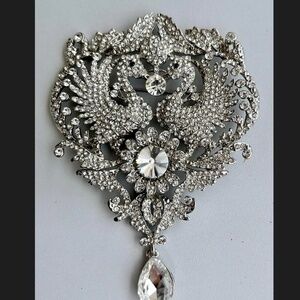 Here's a very dramatic Belle Epoque - style brooch, suitable for a Russian empress--swans facing each other like lovebirds, with a semi-heart shape above and a large Rivoli rhinestone in a flowerlike setting. Plus a dangle, which no imperial brooch would be without.