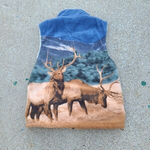 vintage Cozy fleece vest with a striking elk print. Features a blend of blue and tan colors.