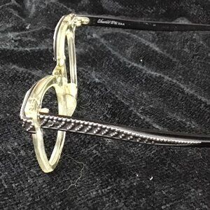 Unusual vintage .Size 5 1/2, clear frames with black design on top and arms. No glass in frames. Horizontal lens 1.75" ,vertical lens 1.25". Very chic looking