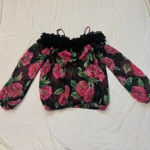vintage forever 21 sheer Pink floral off the shoulder blouse black ruffle trim