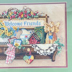 vintage framed cross stitch "welcome friends" wall art floral & rustic motif