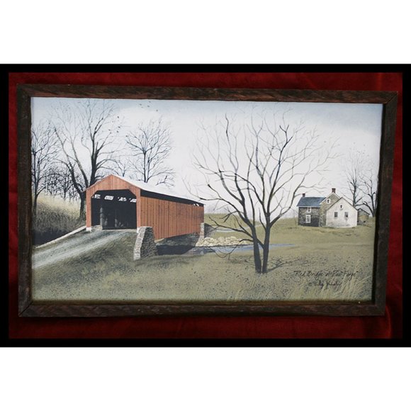 A beautiful rustic framed print titled ``Red Bridge at Pool Forge'' by Billy Jacobs. It features a colorful picture of this wonderful bridge located ion Lancaster County, PA. Size measures 12" x 20" and condition is very good (wooden frame has some light wear).