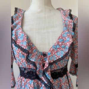 old stock free people. fabric feels to be worn-in soft cotton, ditsy red & blue florals with contrast black lace detail, wild west vibes. ruffled sweetheart neckline & buttons down the ruffled front. skirt is full, superb twirlablity! ๐ flouncy3/4 length sleeves. ties in back. a bit of a high-low, somewhat hidden by RUFFLES! slight discoloration pic #10