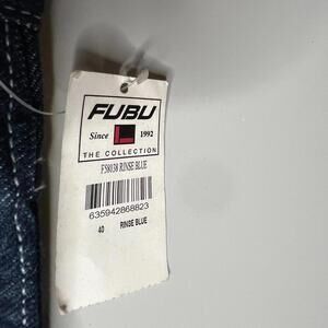 Iconic early 2000s style — baggy fit, dark rinse blue wash, and bold white stitching, true to classic FUBU design.