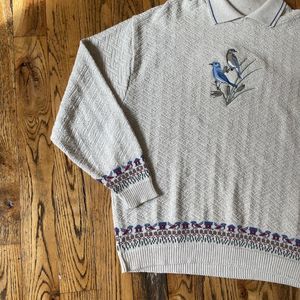 Step back in time with this vintage-inspired collared pullover sweater, perfect for any bird enthusiast. The lightweight knit fabric and long sleeves make it ideal for cooler weather, while the beige color and size L make it a versatile addition to any wardrobe. This pre-owned piece has been well-loved and is in great shape, ready for a new home. Ideal for a regular size type, this sweater is perfect for women who appreciate a timeless look.