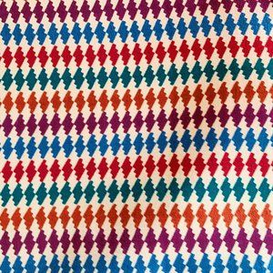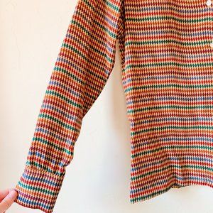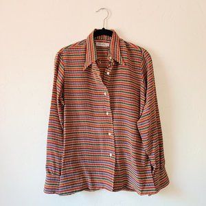 vintage gucci-esq patterned blouse. brand on tag is jaeger paris london ny. cool pattern is tan base with forest green, burnt orange, maroon, deep blue, and burgundy shapes throughout. long sleeve, fitted at the waist, all buttons attached, and collar stays in the collar to keep them looking sharp. 100% silk, dry clean only.